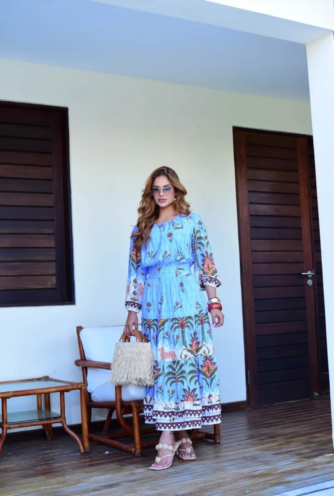 Vestido Mayara, no tecido Vscolinho estampado e cor azul.