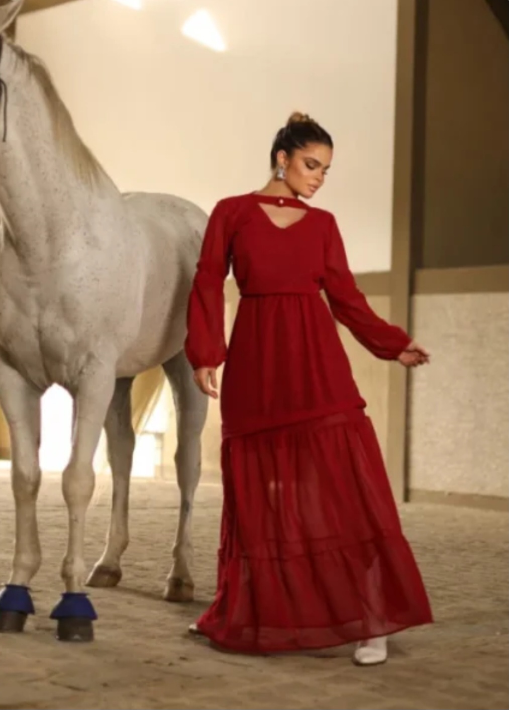 Vestido Sabrina, na alfaiataria, tecido chiffom e cor vermelha.